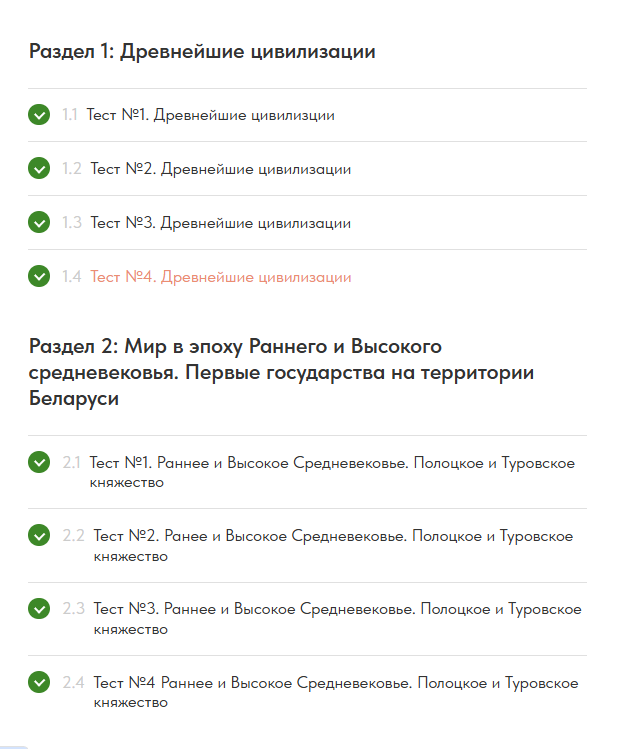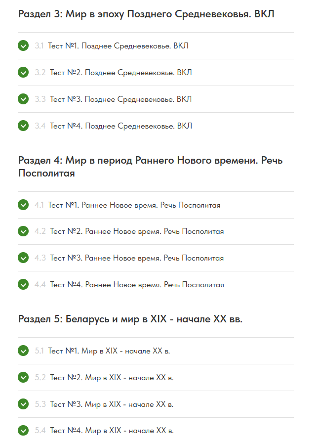 - Форматы, приближенные к реальному ЦЭ/ЦТ: выбор одного или нескольких правильных ответов, задания на соответствие, хронология, понятия и персоналии.