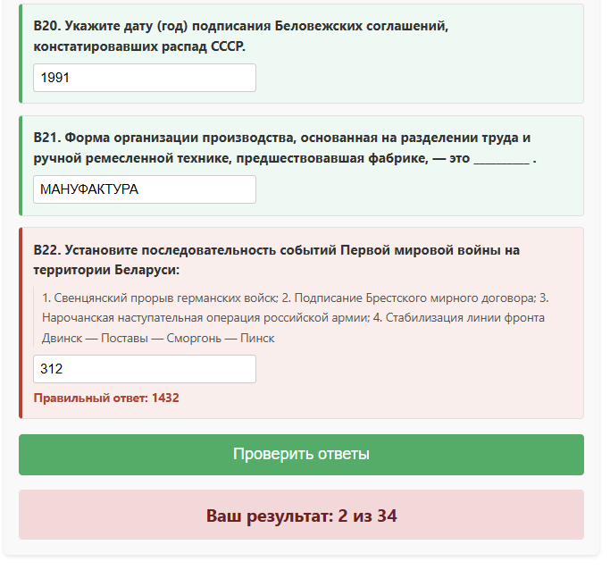 - Вопросы разного уровня сложности: от базовых фактов до заданий на анализ причинно‑следственных связей и сопоставление процессов в Беларуси и мире.